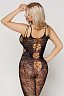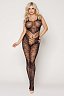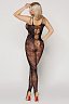 Комбинезон черного цвета изготовлен из эластичной ткани в крупную и мелкую сетку.