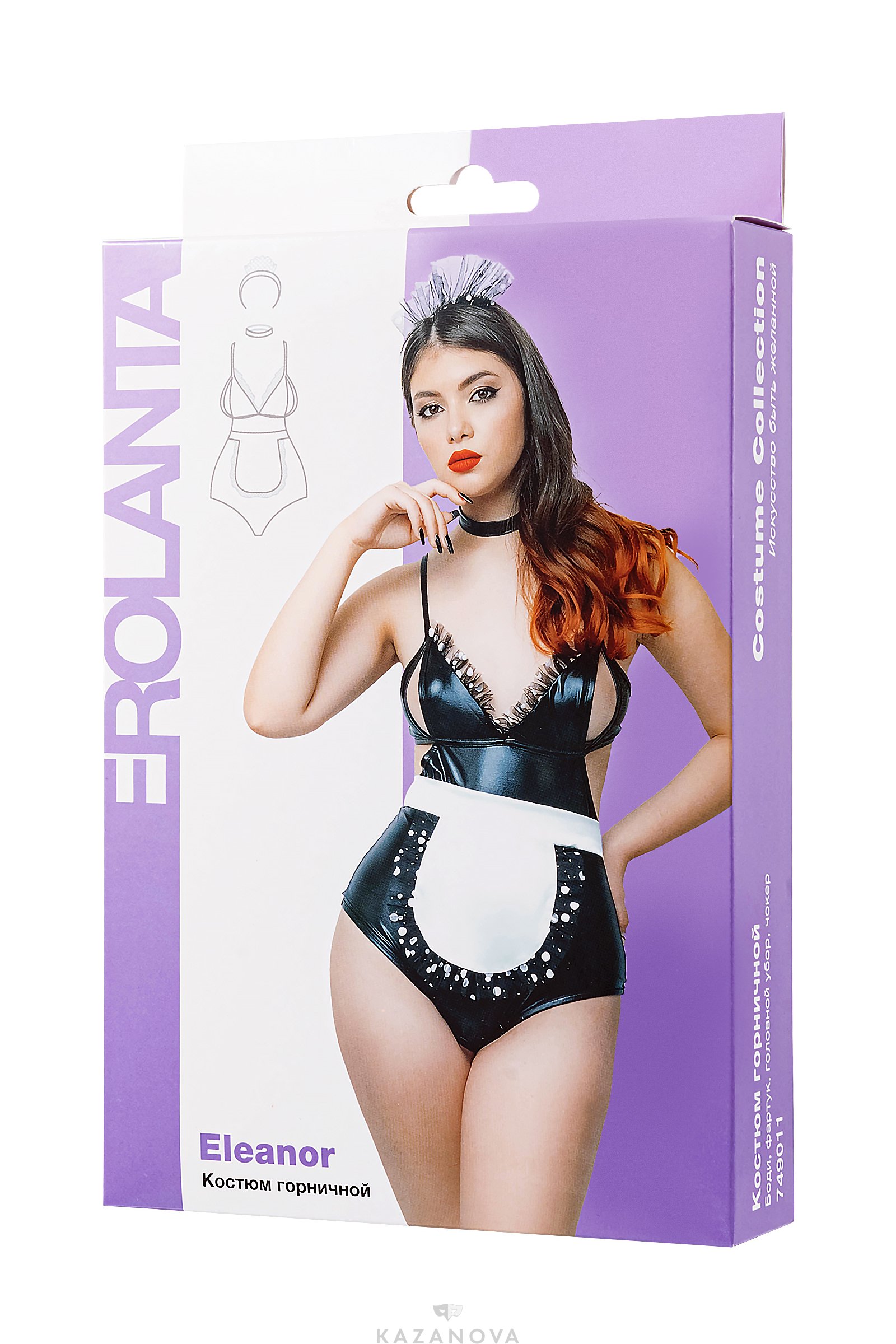 Эротический костюм горничной Erolanta Eleanor выполнен в классической черно-белой гамме и включает в себя: боди с интимным доступом, чокер, фартук и головной убор, украшенные фривольными оборками.