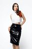Прямая юбка из трикотажной лаковой кожи скрывает животик, даёт небольшую коррекцию силуэта, подчеркивает талию и бедра. Двусторонняя молния сзади добавляет элемент игры и позволяет открыть ягодицы для демонстрации сверху, снизу или с другого ракурса, который придет в голову. Невесомый прозрачный топ из шифона держится на паре кнопочек сзади, не сковывает движений, соблазнительно струится по телу, подчеркивает грудь и обнажает спинку. Воротник-стойка, украшенный игривым бантиком привлекает внимание к взъему груди. Каждое движение в этом легком топе будет волновать воображение и приковывать взгляд.