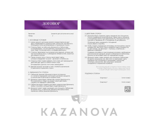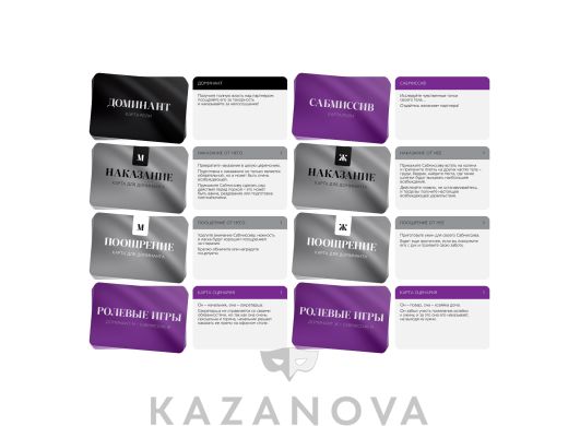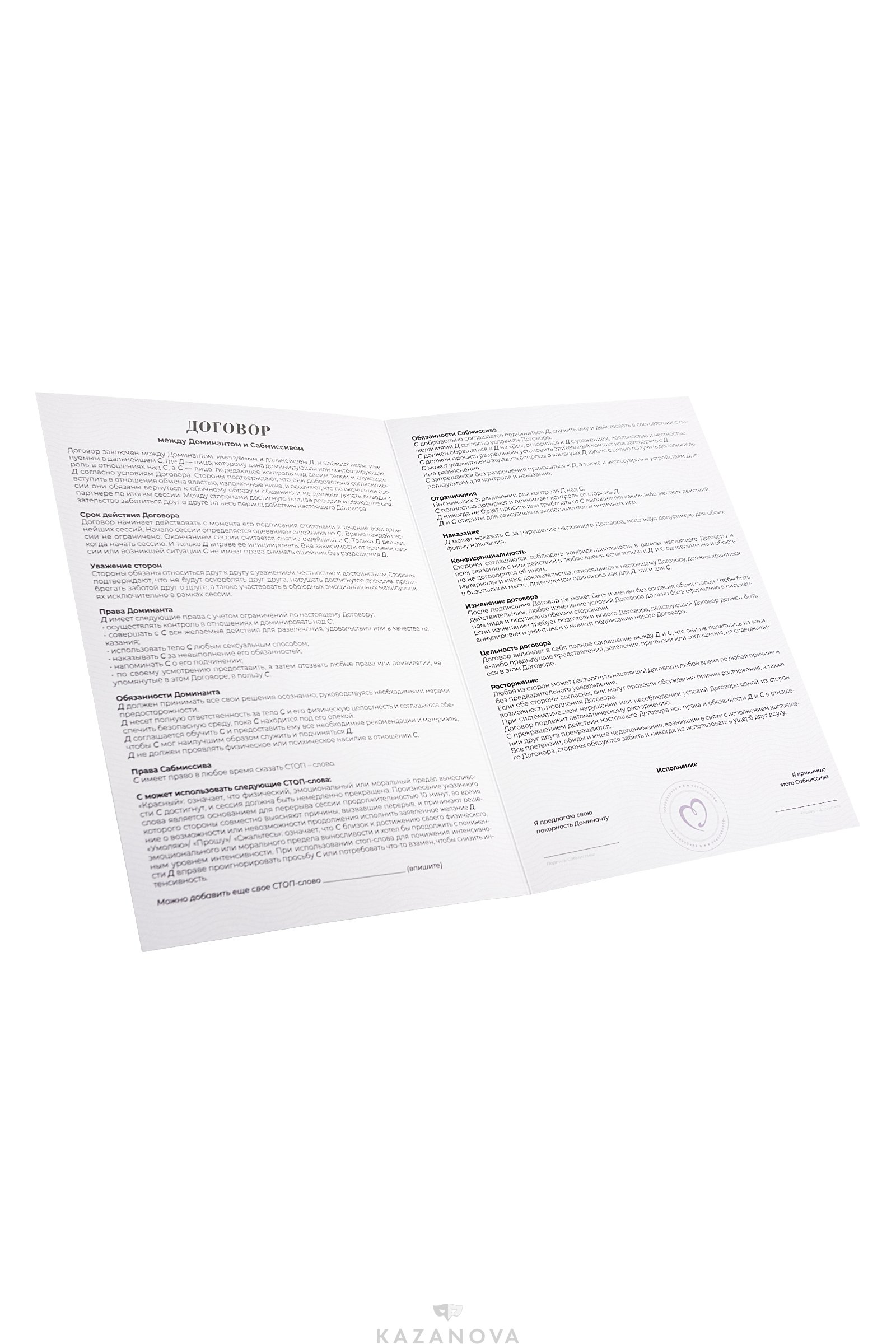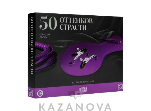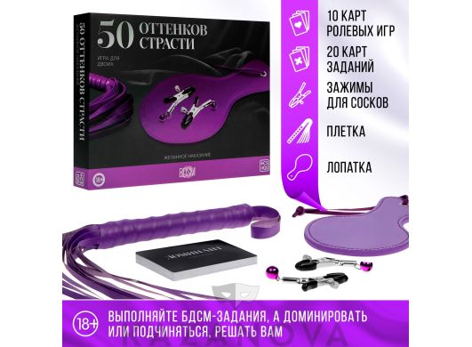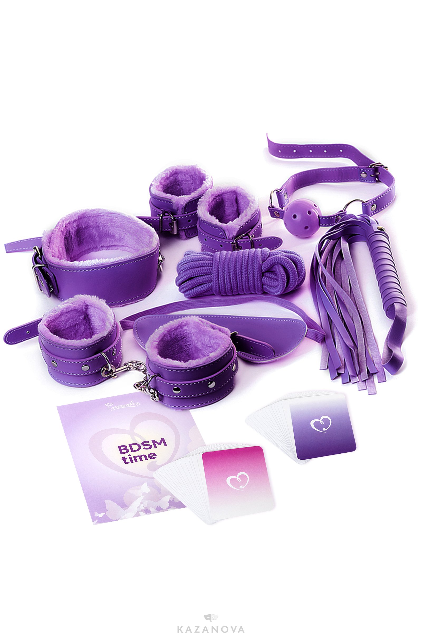 В комплект входят наручники, оковы, ошейник с поводком, верёвка, фиксатор, плётка, кляп, маска, зажимы для сосков, щекоталка.