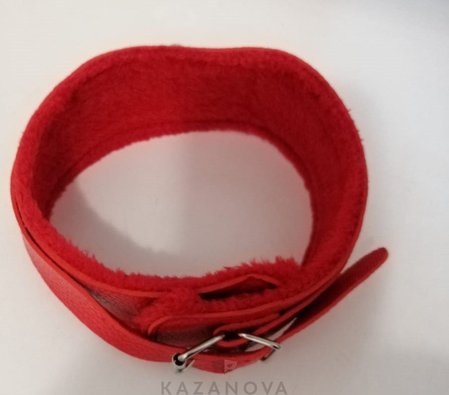Ошейник изготовлен из искусственной кожи красного цвета и декорирован мехом с изнаночной стороны.