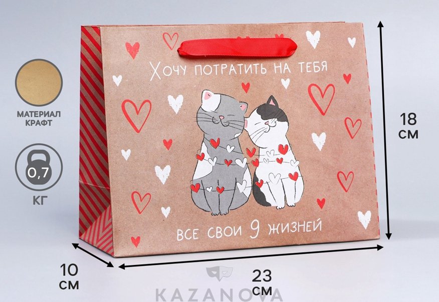 Пакет подарочный крафт «Потрачу девять жизней» 18×23×8 см