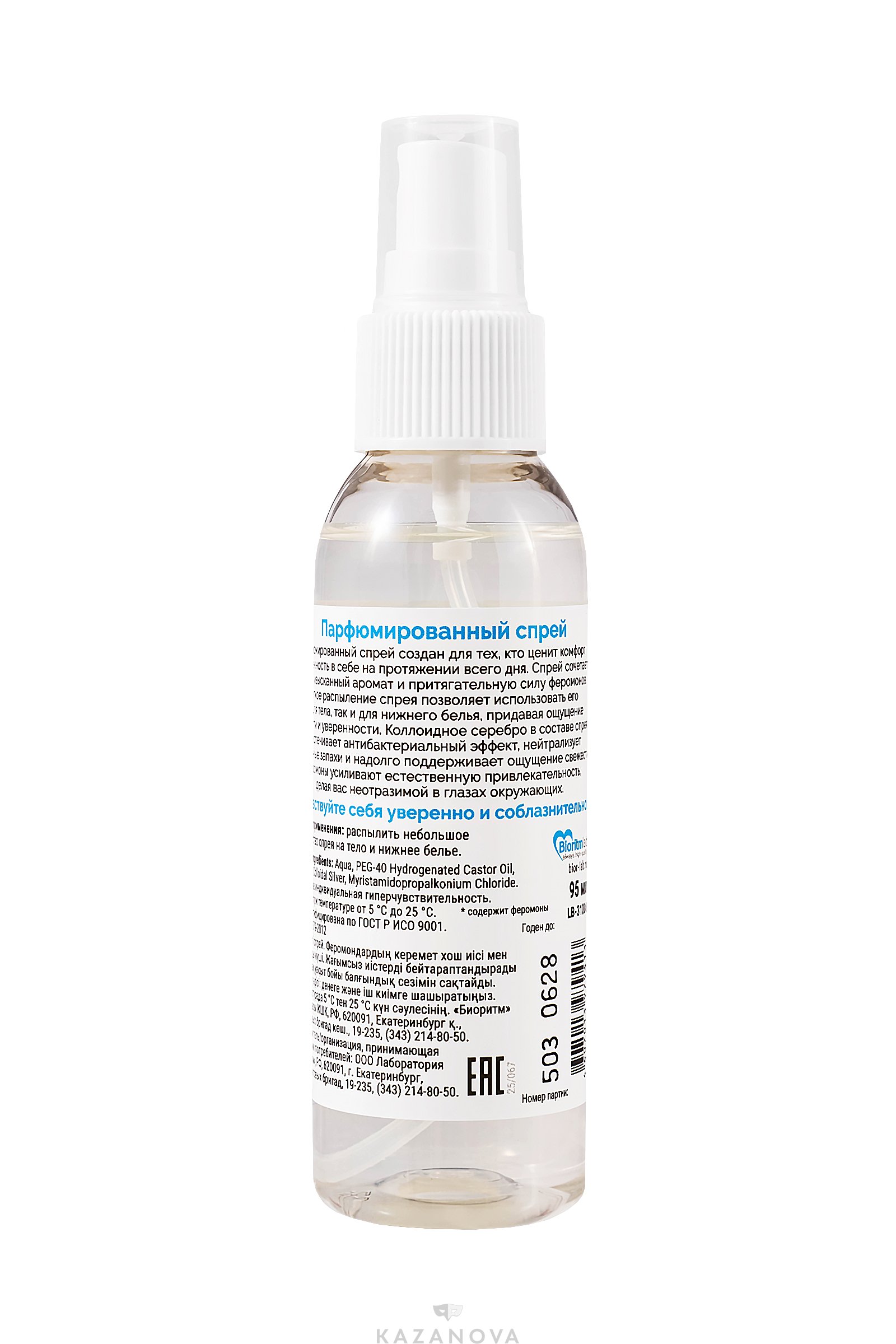 Способ применения: распылить небольшое количество спрея на тело и нижнее белье. Состав Aqua, PEG-40 Hydrogenated Castor Oil, Parfum, Colloidal Silver, Myristamidopropalkonium Chloride. Содержит феромоны.
