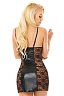 Черное платье с кружевной отделкой и виниловыми вставками изготовлено из полупрозрачной ткани. Платье привлекает внимание к зоне декольте