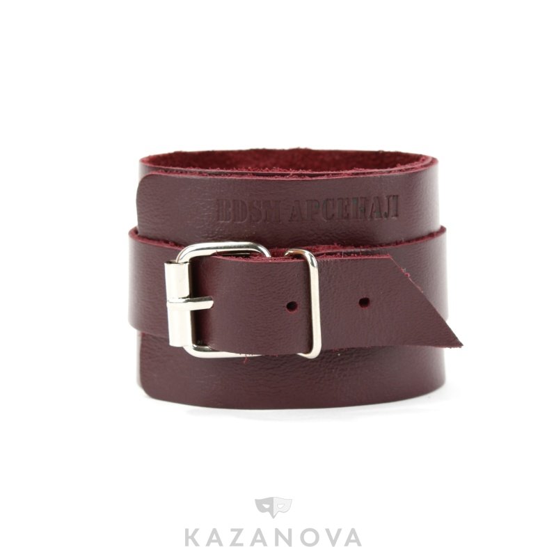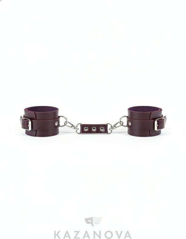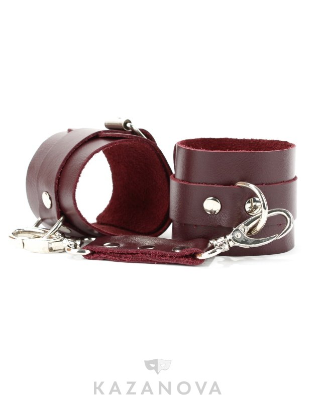Поножи изготовлены из натуральной кожи бордового цвета и декорированы металлическими элементами.