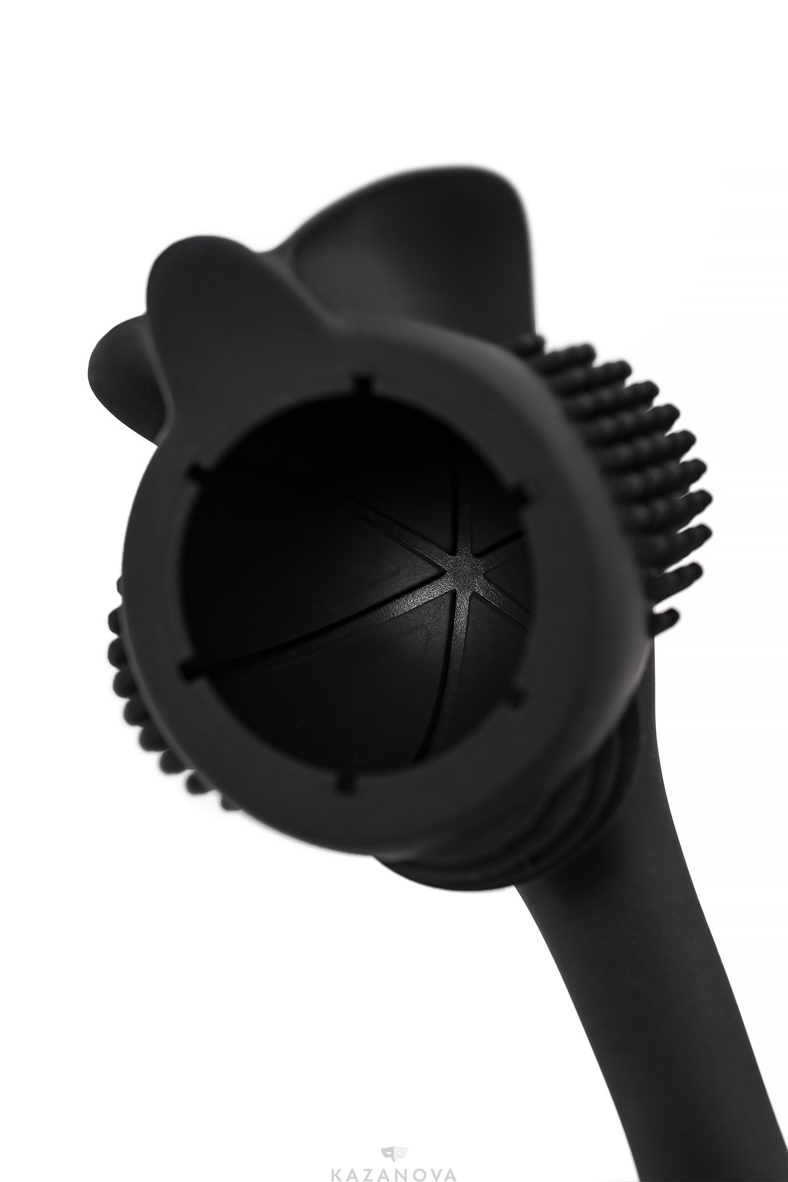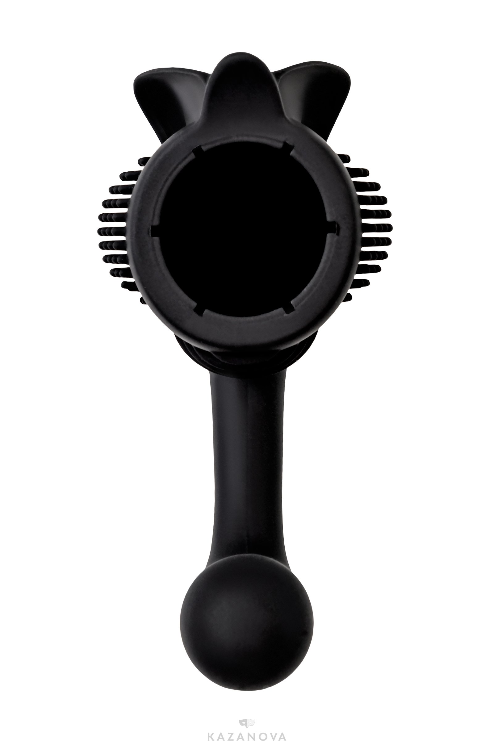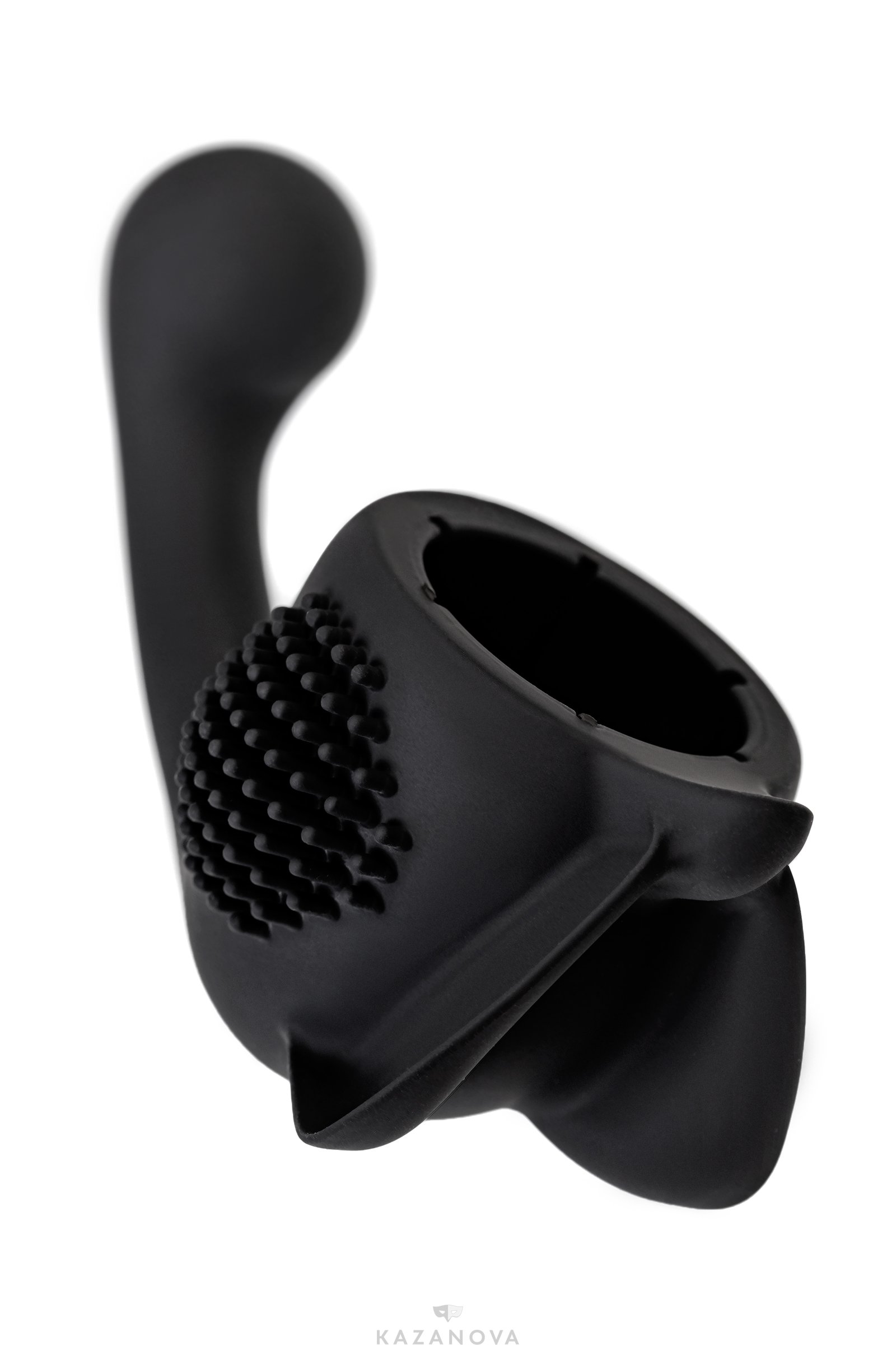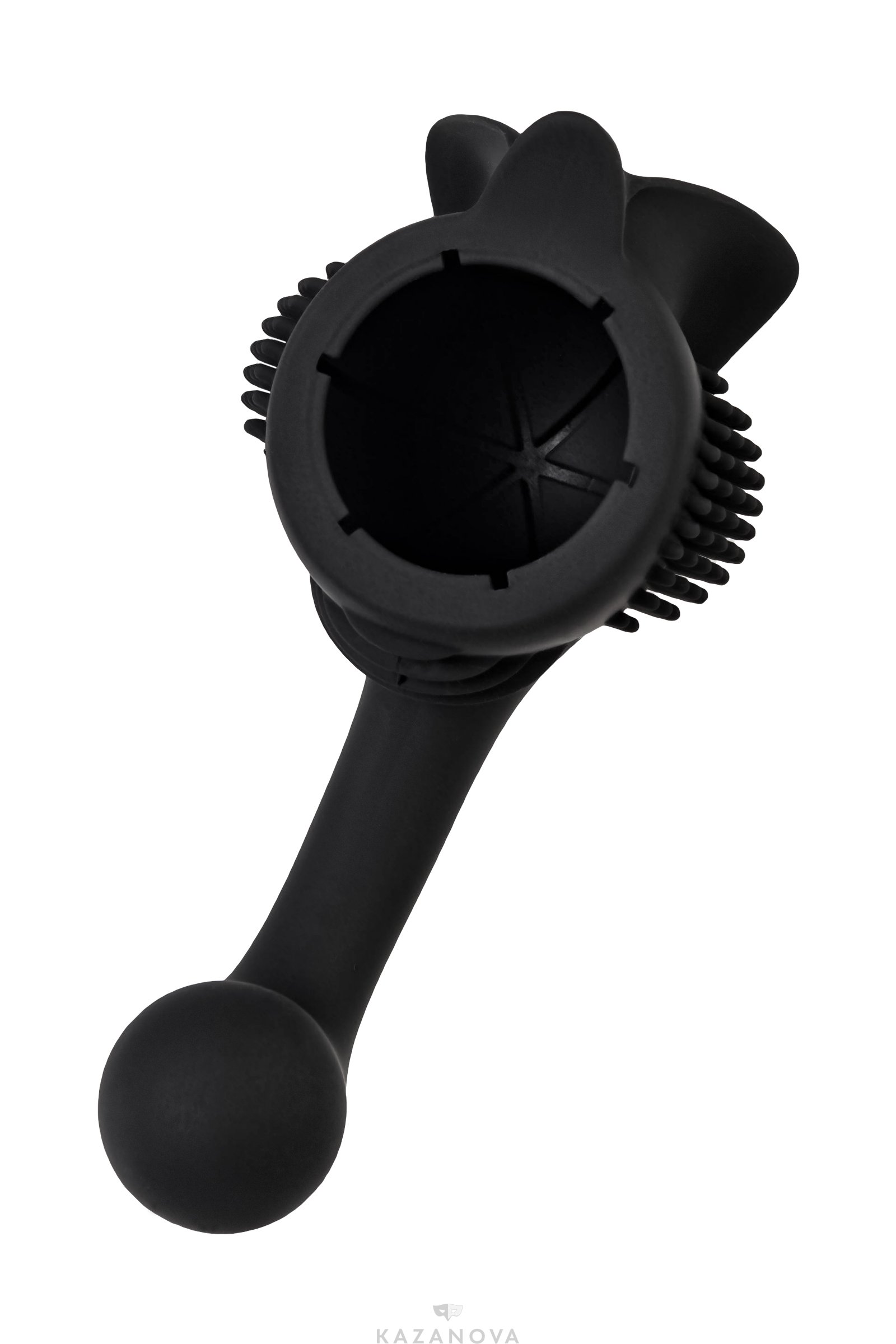Насадка надевается на гибкую головку массажера и плотно на ней фиксируется. Небольшие силиконовые щетинки предназначены для воздействия на клитор, а объемная часть – для стимуляции входа во влагалище, вагины и зоны G.
