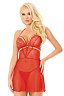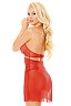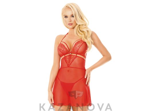 Стильная ночная сорочка в комплекте с трусиками-стрингами сделана из прозрачной сетки красного цвета. Бюст декорирован красивым кружевом и тонкими полосками ткани. Все вместе это подчеркивает соблазнительную форму груди.