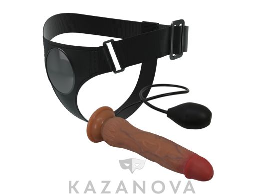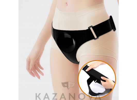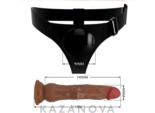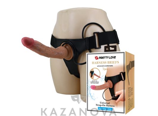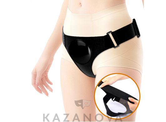 Страпон фиксируется на теле при помощи специальных трусиков со вставками из кожи и заклепками. Трусики плотно облегают тело и подстраиваются под индивидуальные параметры.