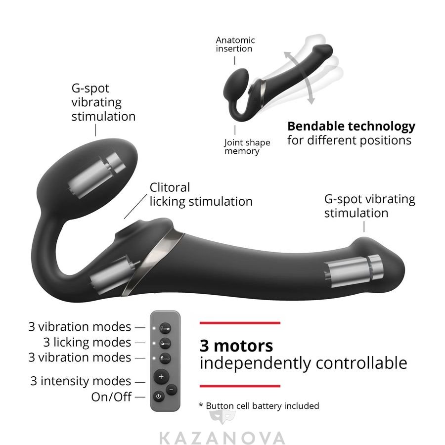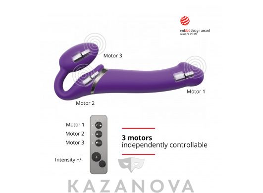 Помимо трех моторчиков страпон оснащен дополнительным вакуумным стимулятором в области клитора.