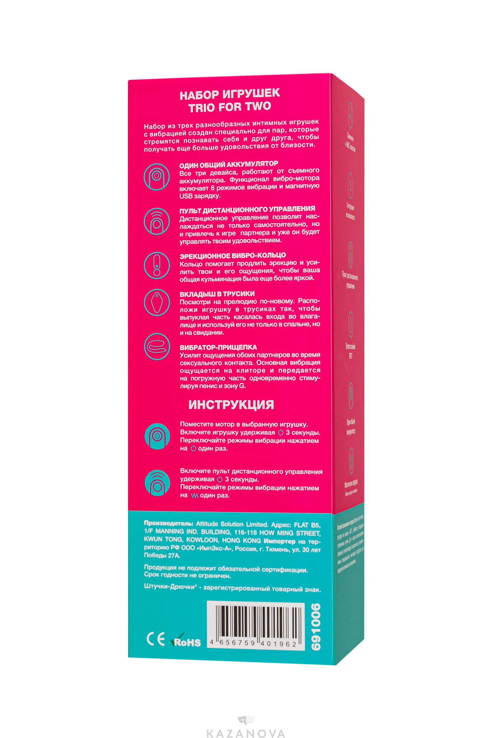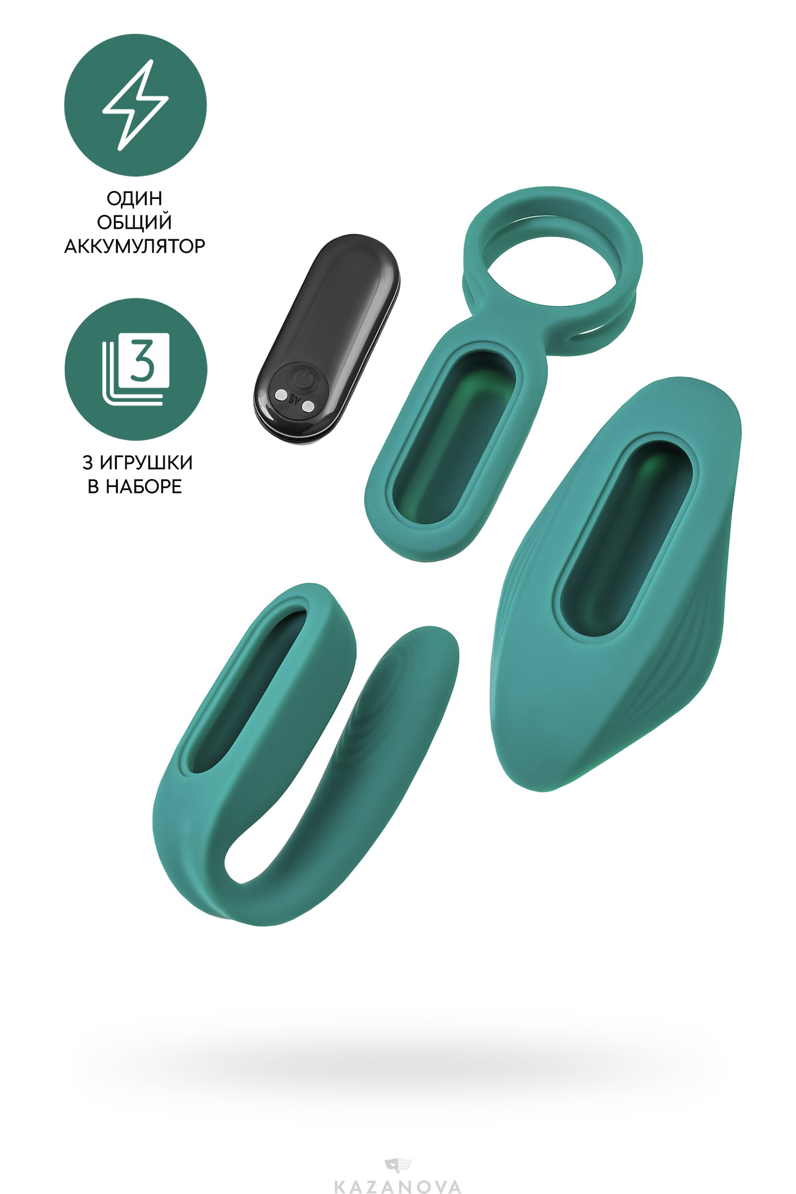Эрекционное кольцо, вибратор для ношения в трусиках и вибратор для двоих. Все три девайса, работают от съемного аккумулятора-вибратора и управляются с помощью пульта. Функционал вибромотора включает 8 режимов вибрации и магнитную USB зарядку. Игрушки выполнены из качественного шелковистого силикона насыщенного изумрудно-зеленого цвета.