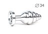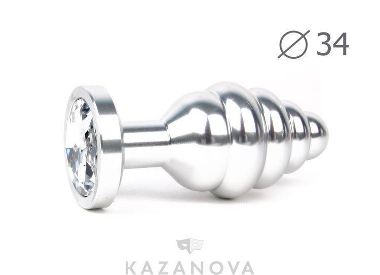Втулка анальная металлическая средняя ребристая серебристая c прозрачным кристаллом